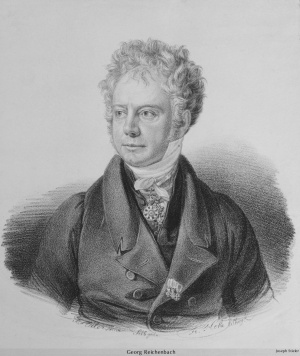 '''Georg Friedrich von Reichenbach''' wurde am 24. August [[1772]] in Durlach bei Karlsruhe geboren und starb am 21. Mai [[1826]]. Der aus der Unteren Pfalz (Region um Mannheim) stammende, wissbegierige junge Mechaniker und Forscher kam [[1796]], im Jahre der Kriegsbelagerung Mannheims, nach [[München]]. Er leistete bedeutende Beiträge zur [[Wasserversorgung]] der [[MVV|Stadt München]]. Zunächst erbaute er in Augsburg 1806 ein neues Gieß- und Geschützbohrhaus. Reichenbach konstruierte u. a. das Vorderladegewehr mit gezogenem Lauf. Reichenbach trug zur Entwicklung exakterer Entfernungsmessinstrumente bei (1801), verbesserte die Drehbänke. Er gründete 1804 zusammen mit [[ | '''Georg Friedrich von Reichenbach''' wurde am 24. August [[1772]] in Durlach bei Karlsruhe geboren und starb am 21. Mai [[1826]]. Der aus der Unteren Pfalz (Region um Mannheim) stammende, wissbegierige junge Mechaniker und Forscher kam [[1796]], im Jahre der Kriegsbelagerung Mannheims, nach [[München]]. Er leistete bedeutende Beiträge zur [[Wasserversorgung]] der [[MVV|Stadt München]]. Zunächst erbaute er in Augsburg 1806 ein neues Gieß- und Geschützbohrhaus. Reichenbach konstruierte u. a. das Vorderladegewehr mit gezogenem Lauf. Reichenbach trug zur Entwicklung exakterer Entfernungsmessinstrumente bei (1801), verbesserte die Drehbänke. Er gründete 1804 zusammen mit dem Bürgermeister [[Joseph von Utzschneider|Joseph v. Utzschneider]] (1763–1840) und [[Joseph Liebherr]] (1767–1840) das „Mathematisch-mechanische Institut“, für das später in Benediktbeuren [[Joseph von Fraunhofer|Joseph v. Fraunhofer]] (1787–1826) arbeitete. | ||