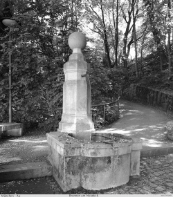 Der '''Brunnen''' mit Trog stammt aus dem Jahre [[1908]]. Das Wasserspiel steht jenseits des [[Auer Mühlbach]]es, gegenüber von Haus Neudeck Nr. 10, der Haftanstalt. Von hier gelangt man über den steilen Verbindungsweg, [[Johann-Holzer-Weg]], hinauf auf die [[Hochstraße]]. Viele Besucher der [[Auer Dult]] müssen an ihm vorbei, wenn sie aus [[Giesing]] heruntersteigen. Und dann auch wieder auf dem Nachhauseweg. An heissen Tagen ist es ein willkommener Ort um dort für einen Moment im Schatten der Bäume und Sträucher zu verweilen, um sich mit dem kalten Wasser die Hände zu waschen, und das Gesicht zu kühlen. Und dank seiner Lage ist es für manchen auch der erste Schluck Wasser in Freiheit. | Der '''Brunnen''' mit Trog stammt aus dem Jahre [[1908]]. Das Wasserspiel steht jenseits des [[Auer Mühlbach]]es, gegenüber von Haus Neudeck Nr. 10, der ehemaligen Haftanstalt. Von hier gelangt man über den steilen Verbindungsweg, [[Johann-Holzer-Weg]], hinauf auf die [[Hochstraße]]. Viele Besucher der [[Auer Dult]] müssen an ihm vorbei, wenn sie aus [[Giesing]] heruntersteigen. Und dann auch wieder auf dem Nachhauseweg. An heissen Tagen ist es ein willkommener Ort um dort für einen Moment im Schatten der Bäume und Sträucher zu verweilen, um sich mit dem kalten Wasser die Hände zu waschen, und das Gesicht zu kühlen. Und dank seiner Lage ist es für manchen auch der erste Schluck Wasser in Freiheit. | ||