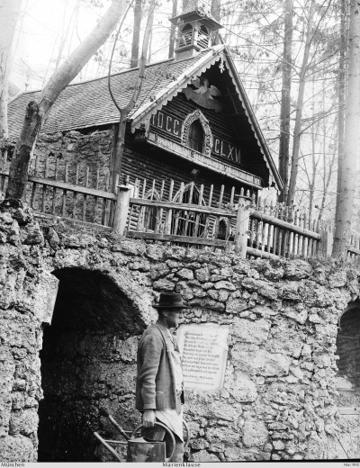 - "Nachdem nunmehr die Menterschwaige wieder dem allgemeinen Besuch geöffnet ist, können wir nicht umhin, die Münchener und die Fremden auf den reizenden Weg aufmerksam zu machen, der durch die Isarauen vorthin führt, indem dortselbst durch die Bietät eines wackeren Mannes den Touristen eine Überraschung bereitet ist, wie man sie nicht schöner und sinniger erwarten kann. Da wo der Weg zwischen Harlaching und der Menterschwaige vom Isarufer hinauf auf die Höhe führt, nahe bei seinem Anwesen hat der Wasseraufseher Achleitner eine Marienklause nebst einem Kreuzweg errichtet; daneben spendet die Jakobsquelle labenden Trunk, zierliche Bänke und Tische aus Naturholz laden unterm Laubgrün zur erquickenden Rast ein und auf der entgegengesetzten Seite des Weges ist eine größere Rotunde mit zwei ruhenden Löwen hergestellt. Hübsche Werke erklären dem Wanderer den Zweck und Sinn dieser idyllischen Anlage, und wahrlich, ehren muß den Biedersinn eines Mannes, der in der uneigennützigsten Weise seinen Mitbürgern die Benützung dieser Ruheplätzchen gestattet."