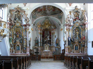 Der Hochaltar wurde von Johann Baptist Straub errichtet. Kanzel und rechter Seitenaltar stammen von Ignaz Günther. Die Deckengemälde stellen das Martyrium des Heiligen Georg und seine Aufnahme in den Himmel dar.