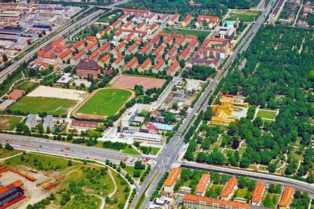 [[Datei:Alte Heide.jpg|thumb|450px|Blick über Schwabing und die Siedlung im Jahr 1976. Foto; Schillinger.]] | |||