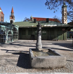 Ein gusseiserner, modifizierter Pumpbrunnen auf dem Viktualienmarkt. Umgeben vom Milchhäusel und dem Honigstandl, hier als Namensgeber für unseren Honig-Brunnen.
