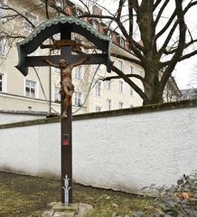 München, Giesing, Unter-Giesing, Hans-Mielich-Straße. Vor der Einfriedung des Pfarrhauses der Franziskuskirche steht dieses Wegkreuz. Geschnitze Jesusfigur, Keine Rückverblendung, Vierkantbalkekreuz, Geschwungenes Kupferblechdach.