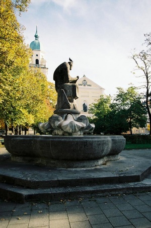Der nach Kriegszerstörung aus einem mächtigen Jonas- zu einem Franziskus-Berg mutierte Brunnen "bedarf" quasi des italienischen Ambiente einer sonnenbeschienenen Piazza mit Kirchenfassade im Hintergrund, wie sie ihm die katholische Josephskirche bietet (1898 - 1902, von Hans Schurr).