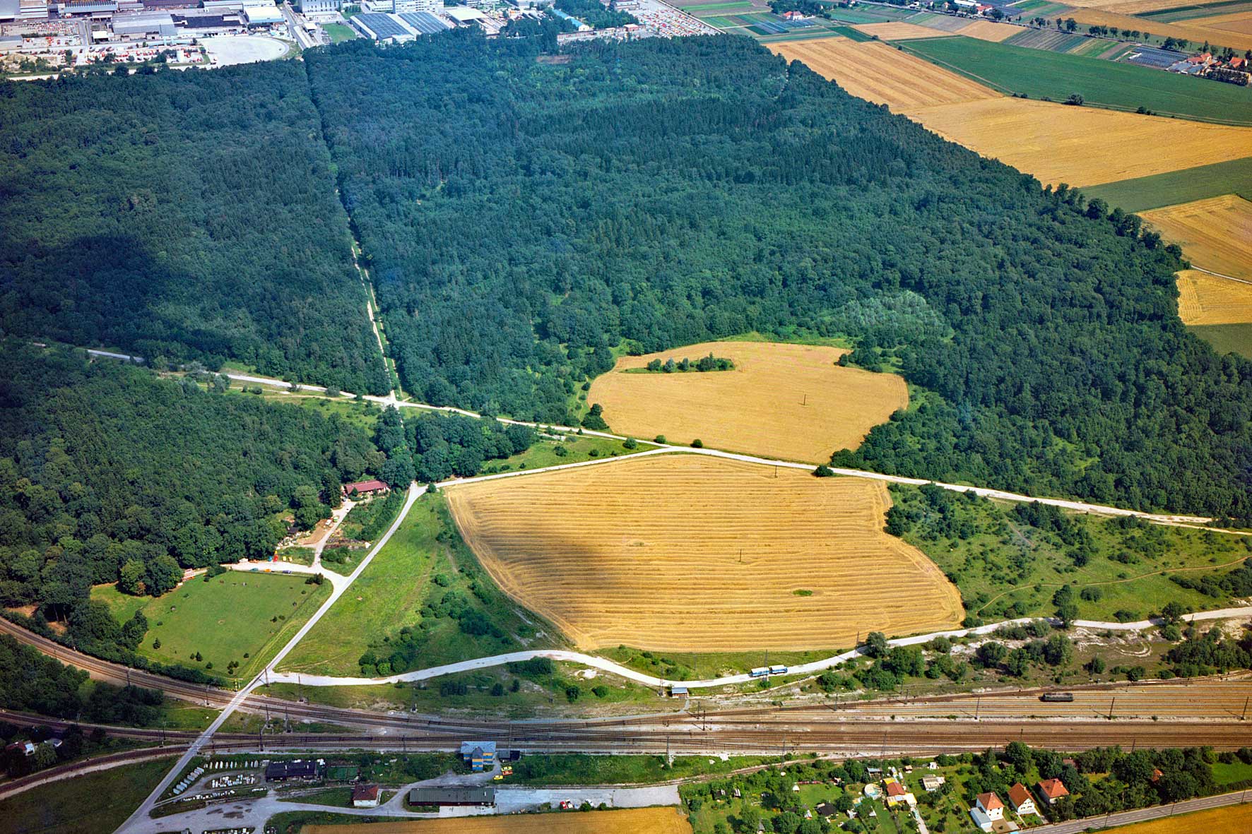 Die Angerlohe in Allach nach Norden. Übrigens wurde die von mir 1984 produzierte Dia-Reihe "Naturkundliche Lehrwanderungen Angerlohe" für die Schulen von München nie in Anspruch genommen und so gingen viele Jahre an Unwissenheit der Schüler über die Natur in der Stadt verloren.