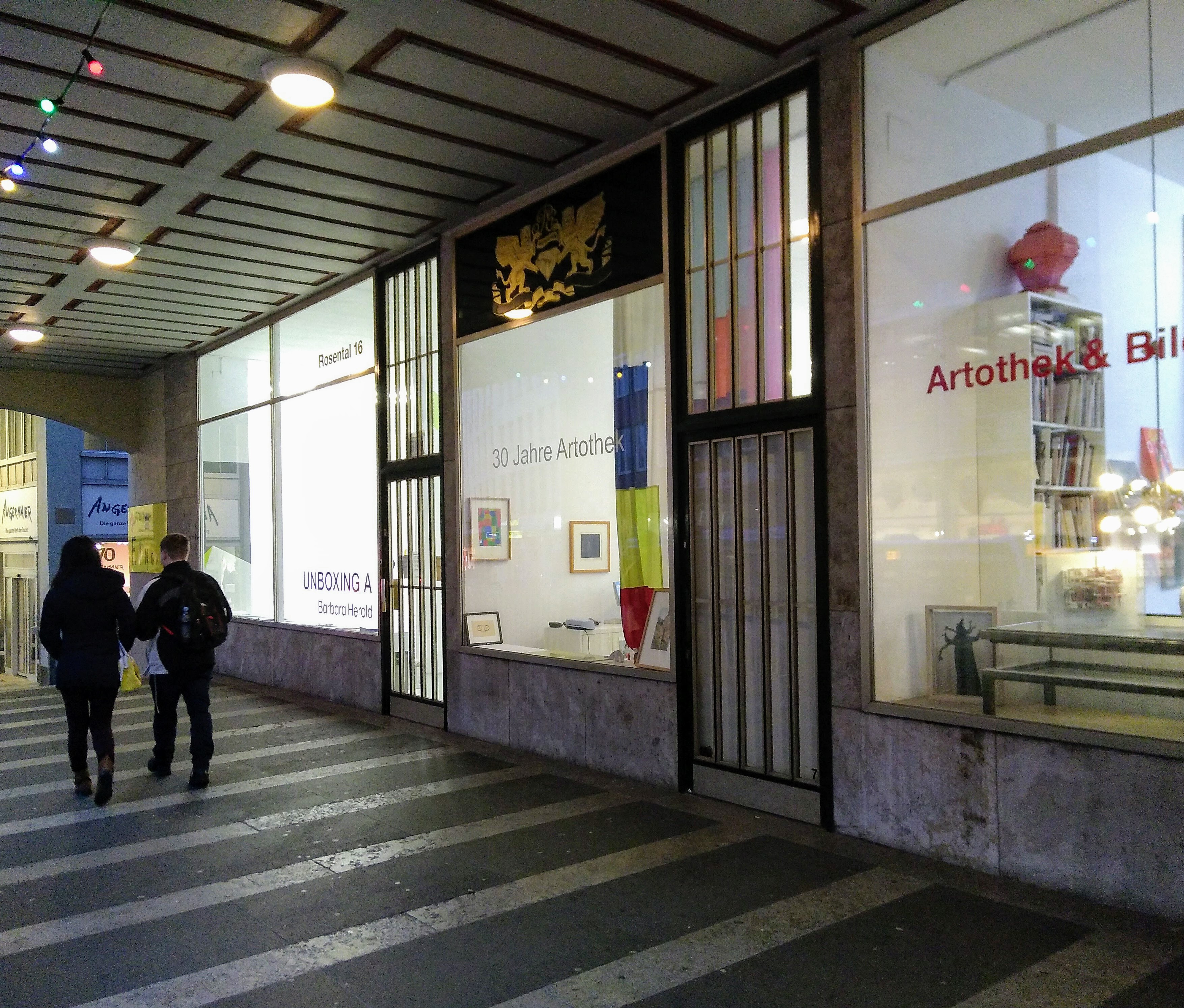 Der Eingangsbereich zur Münchner Artothek in einer Passage zwischen Rindermarkt und Viktualienmarkt