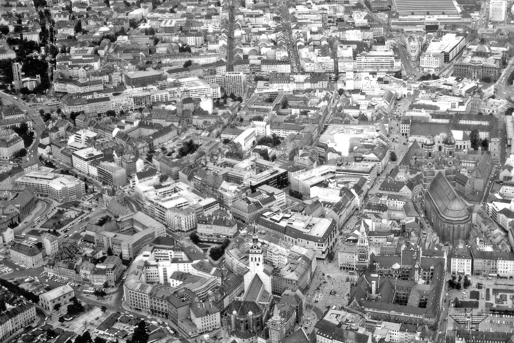 Weil für Stadtsanierung, Stadtplanung und Denkmalschutz immer wieder Fotografien angefertigt wurden, ist hier das Hackenviertel zwischen Sendlinger- und Kreuzstrasse. Gut erkennbar ist der Marienplatz mit Fussgängerzone.
