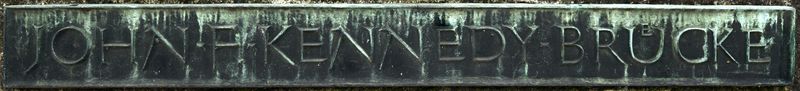 München. John-F-Kennedy-Brücke, Beschilderung. An den linken und rechten Brückeneinfassungen ist jeweils eine dieser Namenschilder angebracht. Der Schriftzug ist mit "Rothemund" unterschrieben. Zustand 2019.