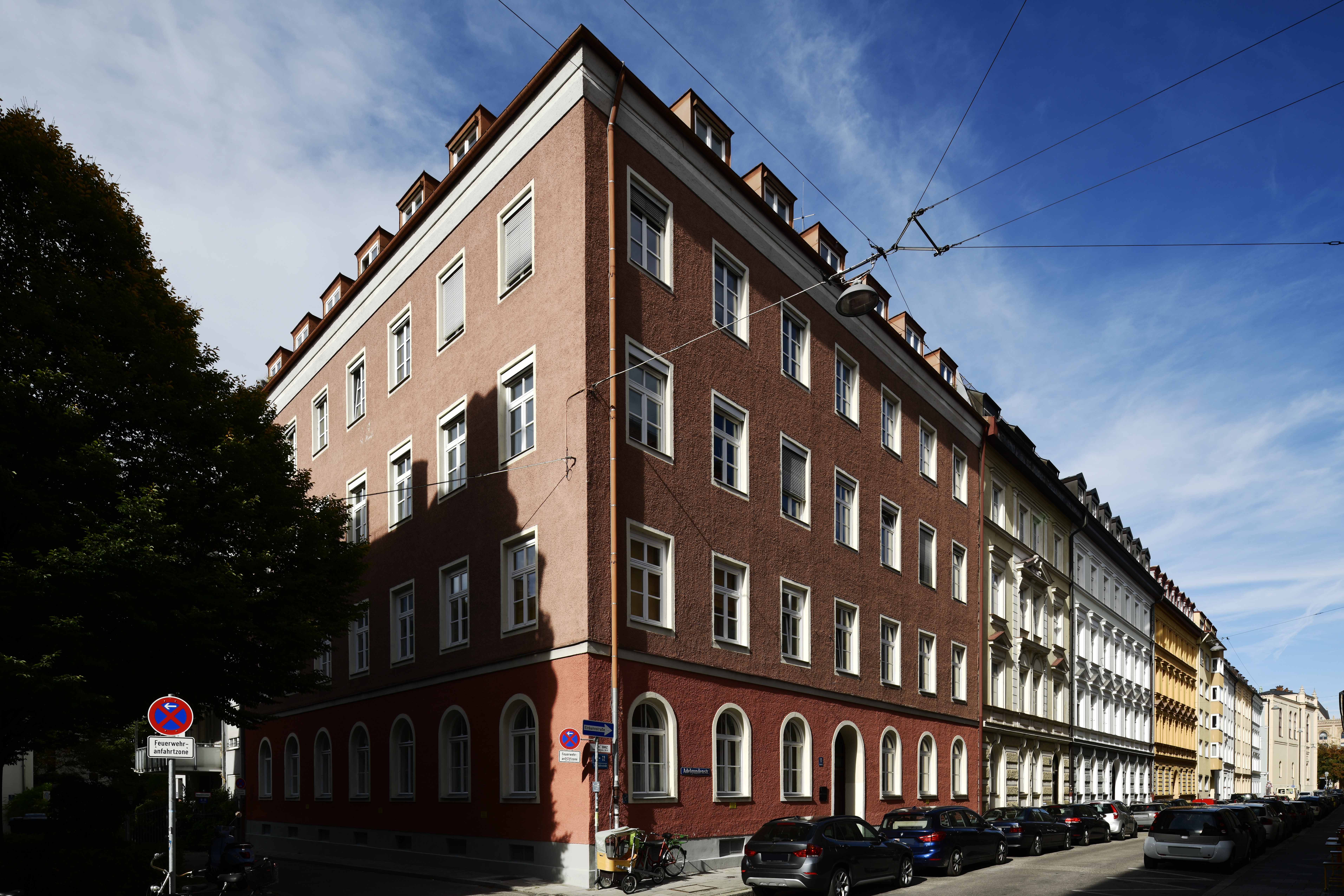 München, Lehel. Blick entlang der Fassaden der Adelgundenstraße. Zustand 2019.