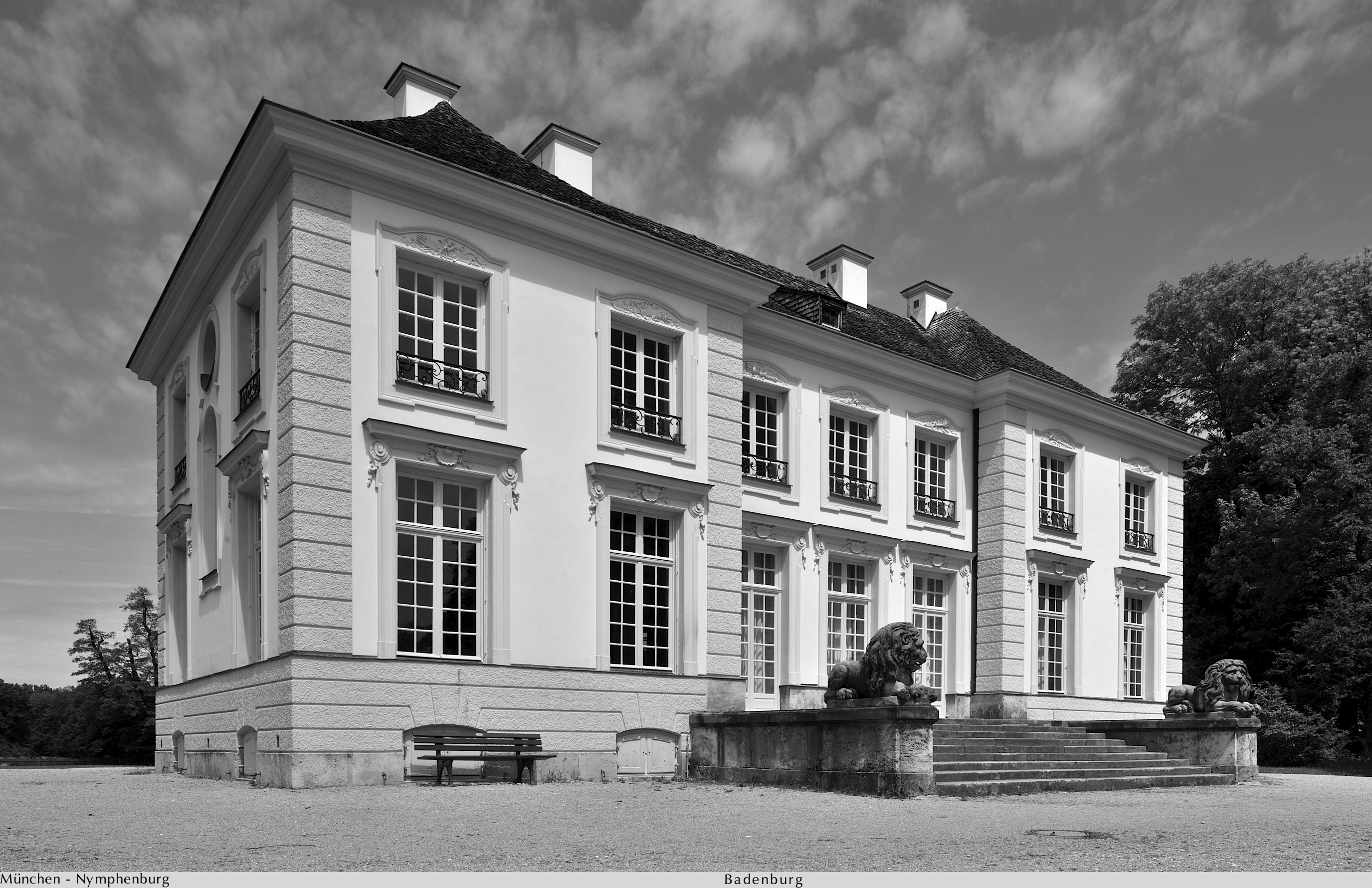 München. Die Badenburg im Schlosspark zu Nymphenburg am grossen See durch die Anordnung des Kurfürsten Max Emanuel im Jahre 1718 entstanden. Eine Fotoansicht eigens entstanden im Frühling des Jahres 2012 für München Wiki und alle Anderen. (perspective controll lens nikon 24-PC) Urheber waren und sind die Künstler und Handwerker die dieses wunderbare Bauwerk erdacht und erschaffen haben.