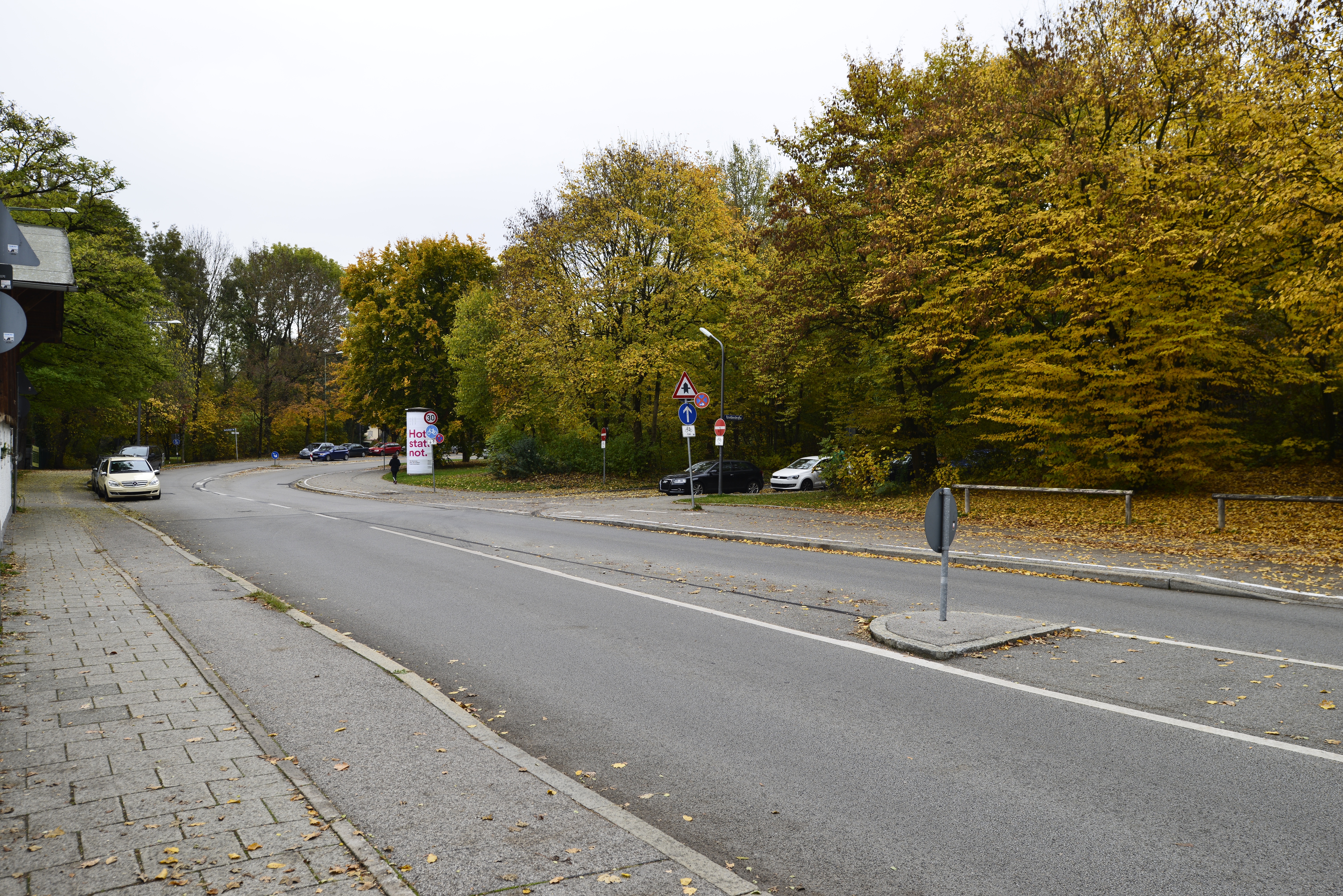 München, Harlaching, an der ehamligen Wendeschleife der Trambahn an der Karolingerallee, gegenüber der kleinen St. Anna Kirche. Oktober 2015.