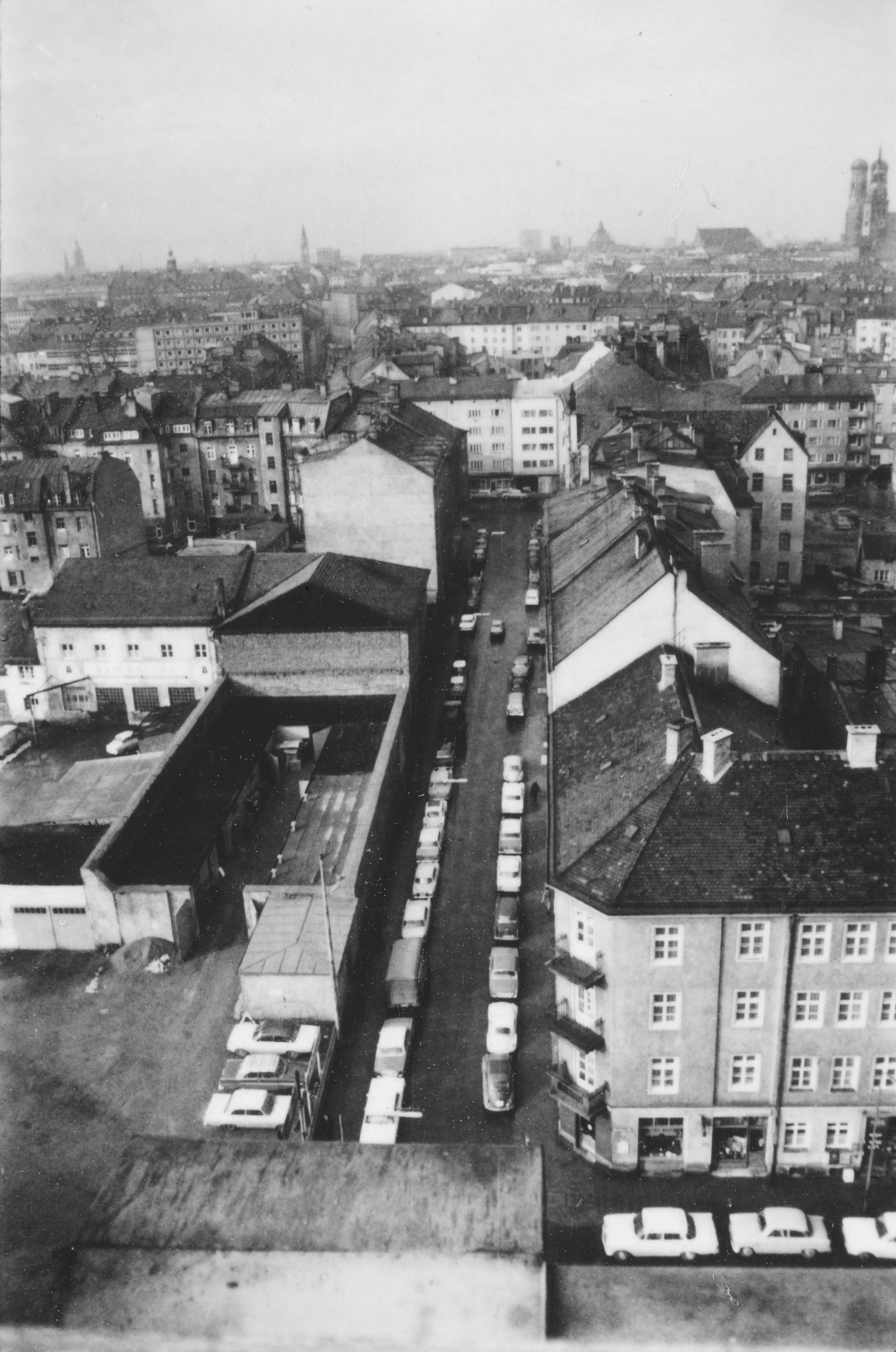München, Altstadt. Blick vom Dach des Patentamtes auf die Kohlstraße hinunter. Auf der linken Bildseite, abgeschnitten, das ehemalige Areal von Beissbarth, nachmals Beissbarth & Müller, Auto-Reparaturwerk, München 5, Kohlstraße 2. Damals Vertragswerkstätten für Saurer, Kaelble oder auch die Zahnradfabrik Friedrichshafen. Die Werkstätten waren in den ehemaligen, und Kriegsbeschädigten, Reithalle der Maximilians-Reitschule untergebracht. Das Areal wurde 1970-1971 abgeräumt. Es wurden auch alle Wohnhäuser abgerissen, die dort den Krieg unbeschadet überdauert hatten. Rechte Bildseite, unten die Morassistraße mit dem Eckhaus. Es steht dort fast unverändert.