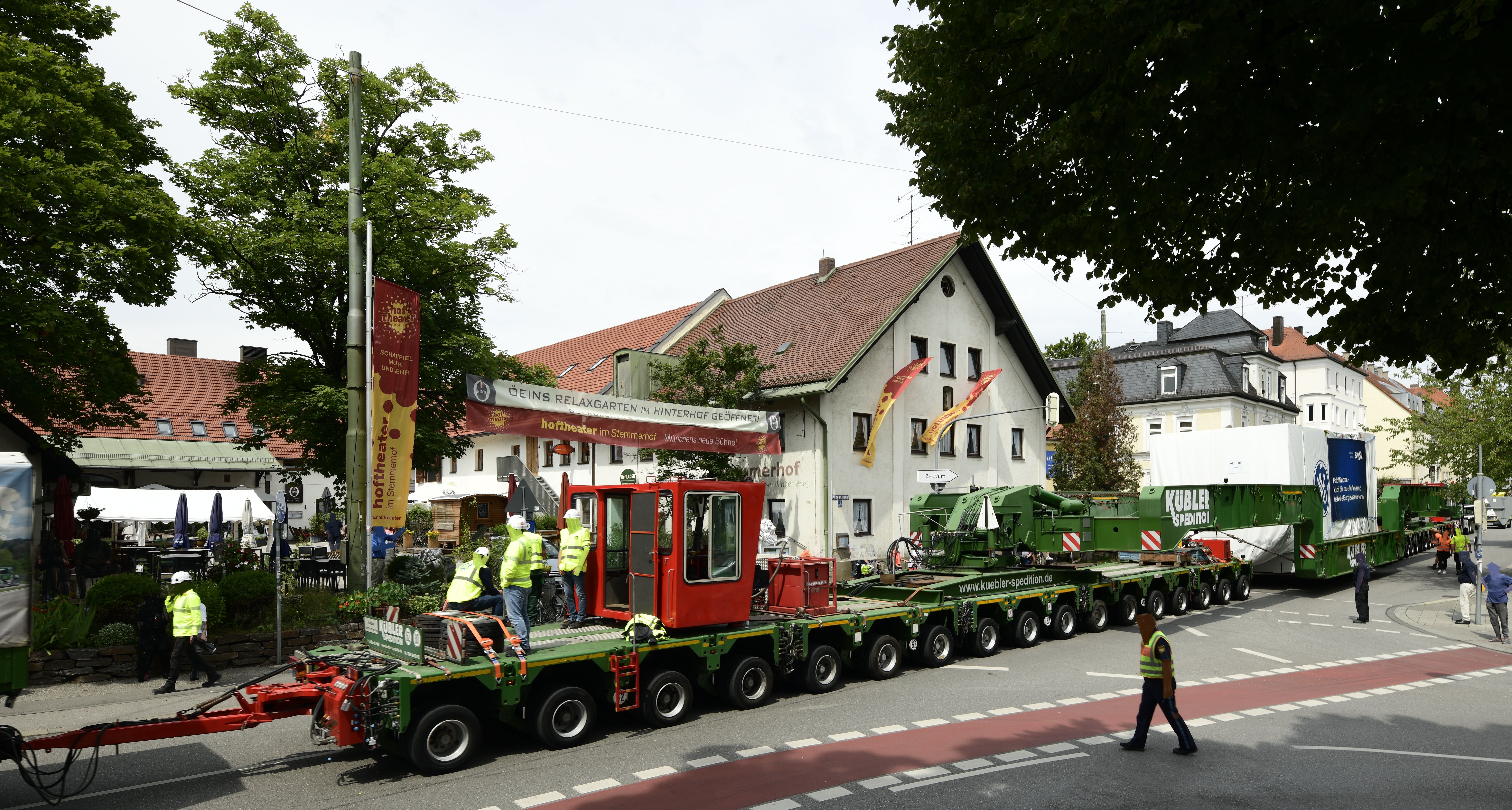 München, Sendling. Blick auf die Kreuzung Plinganserstraße Ecke Lindwurmstraße, und auf den Stemmerhof. Auf der Straße keine Trambahn aber, ein Schwertransport der eine Turbine zum Heizkraftwerk an der Schäftlarnstraße transportiert.