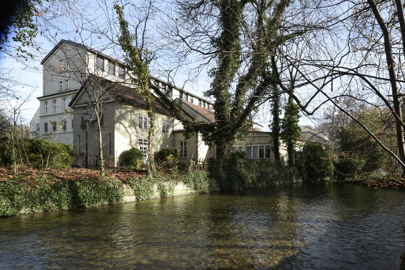 München, Englischer Garten Nord. Entlang der ehemaligen Loden Frey Werke fließt der Bach weiter Richtung Norden.