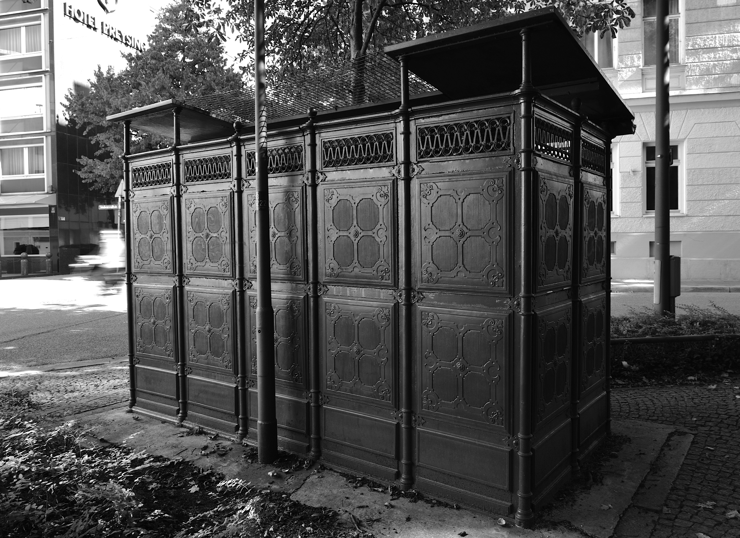 München. Am Eingang zur Kellerstraße, gegenüber der Stubenvollstraße, steht diese reizvolle Ausführung einer Bedürfnisanstalt aus der Zeit um 1900. (Nikon Pc-24)