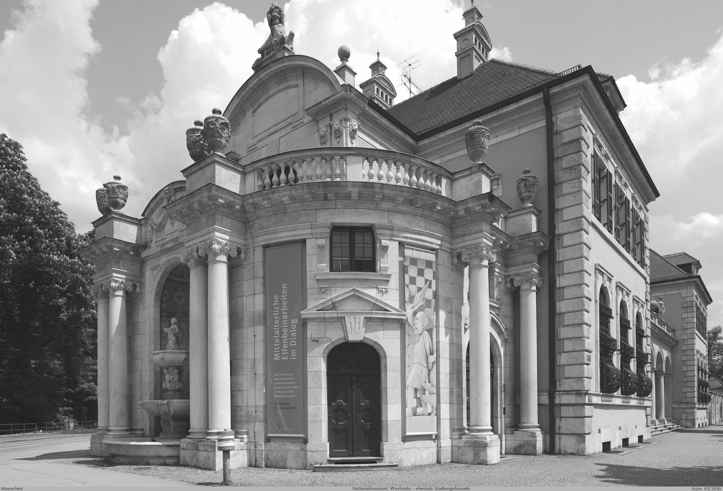 Bayerisches Nationalmuseum. Blick auf den Trackt gen Südwesten mit dem alten Studiengebäude. Links der Nischenbrunnen Fischfraubrunnen, der mit in die Rückwand eingelegten Flusskieselsteine, gestaltet von Joseph Rauch im Jahre 1900. Eigens für München Wiki fotografiert. (Nikon PC-24)