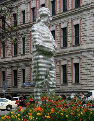 Das über 6 Meter hohe Standbild steht ohne Sockel mit beiden Beinen auf der Erde. Es wurde von der Berliner Professorin und Künstlerin Katrin Sander (*1957 in Bensberg, Nordrhein-Westfalen) gestaltet. Das 9,5 Tonnen schwere Denkmal wurde aus einem massiven Aluminiumblock gefräst. Seine Aufstellung erfolgte am 25. April 2005. Das Denkmal ist wegen seiner Gestaltung bei der Münchner Bevölkerung umstritten.