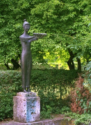 Ein lächelndes Mädchen, von zierlicher Gestalt und mit keckem Haarschopf, reicht vor dem Englischen Garten, der noch sommerlich durchschimmert, eine Muschelschale, in der gelegentlich kleine Springbrünnlein Wasser spenden, das in die Schale und über deren Rand in das ebenerdige Brunnenbecken pritschelt.