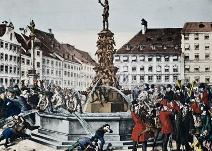 Allzu lustiges Treiben führte oft zu Ausschreitungen, sodass 1793 der Metzgersprung durch den Kurfürsten verboten wurde. Maximilian II. aber ließ diesen alten Brauch wiederaufleben, und seitdem zogen die mit Kälberschwänzen behangenen Metzgerbuben wieder alljährlich am Faschingsmontag zur Taufe an den Fischbrunnen, die dort in althergebrachter Weise erfolgte.